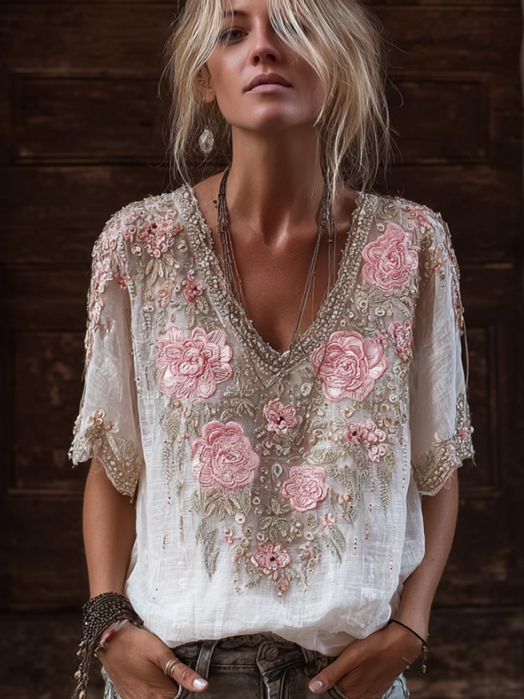 Bohemian Shattered Vintage Style Embroidered Flower Short-sleeved Shirt