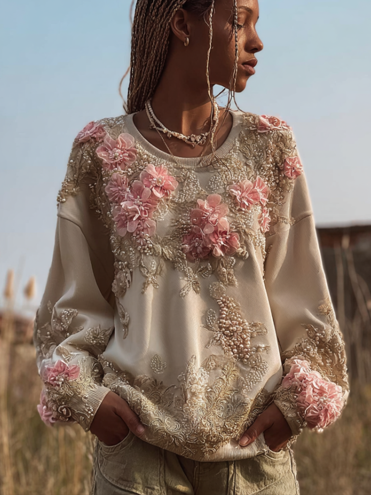 Bohemian Style Round Neck Long Sleeve 3d Floral Design Women's Top