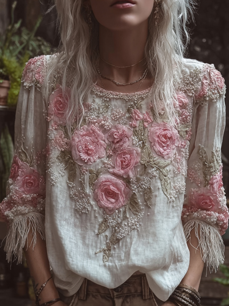 Bohemian Three-dimensional Floral Embroidery Casual Vintage Long-sleeved Shirt