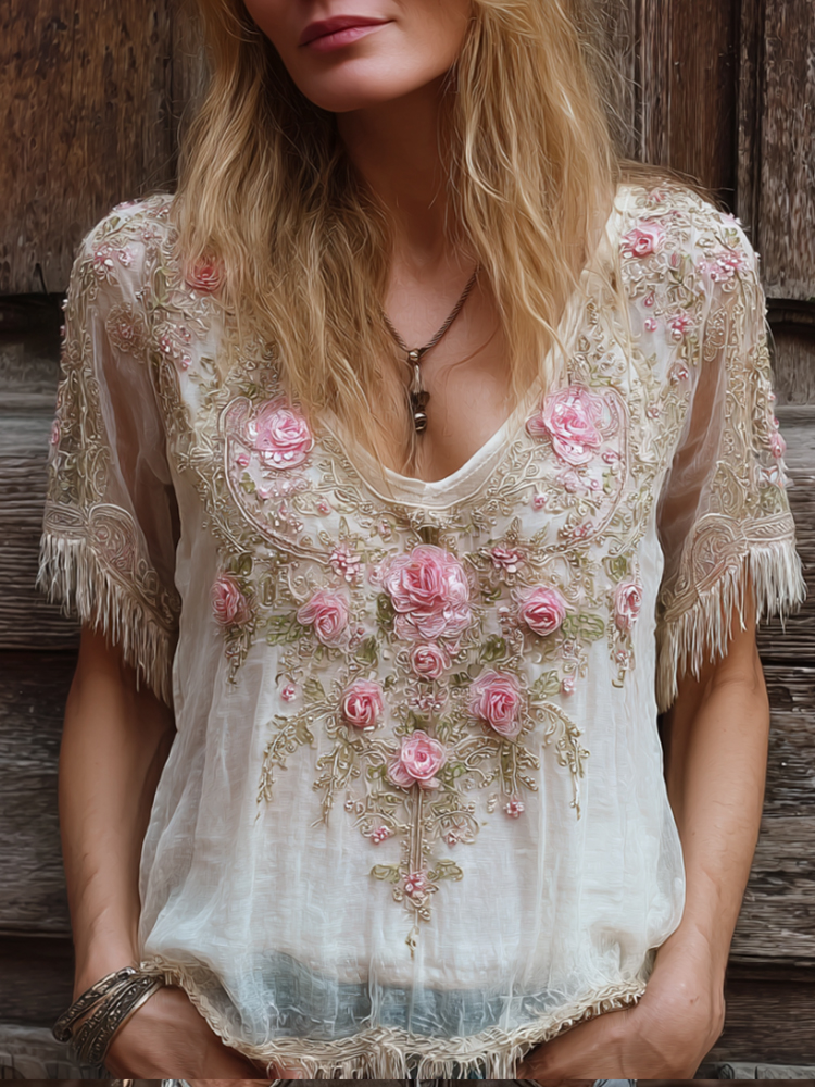 Bohemian Vintage Distressed Embroidered Flower Short-sleeved Shirt