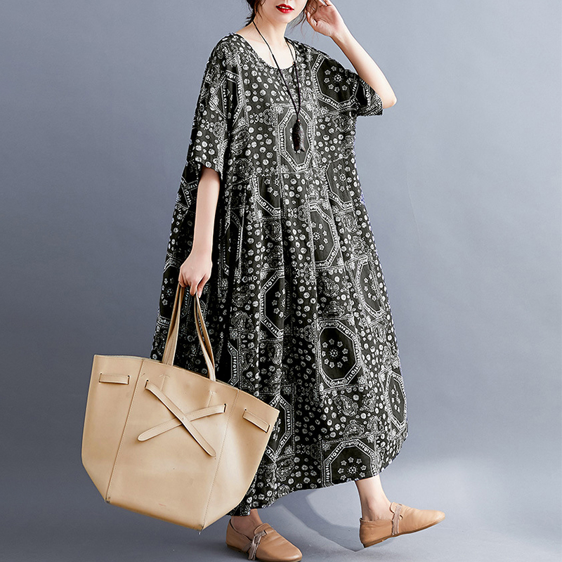 Loose Cotton And Linen Printed Short Sleeved Midi Dress