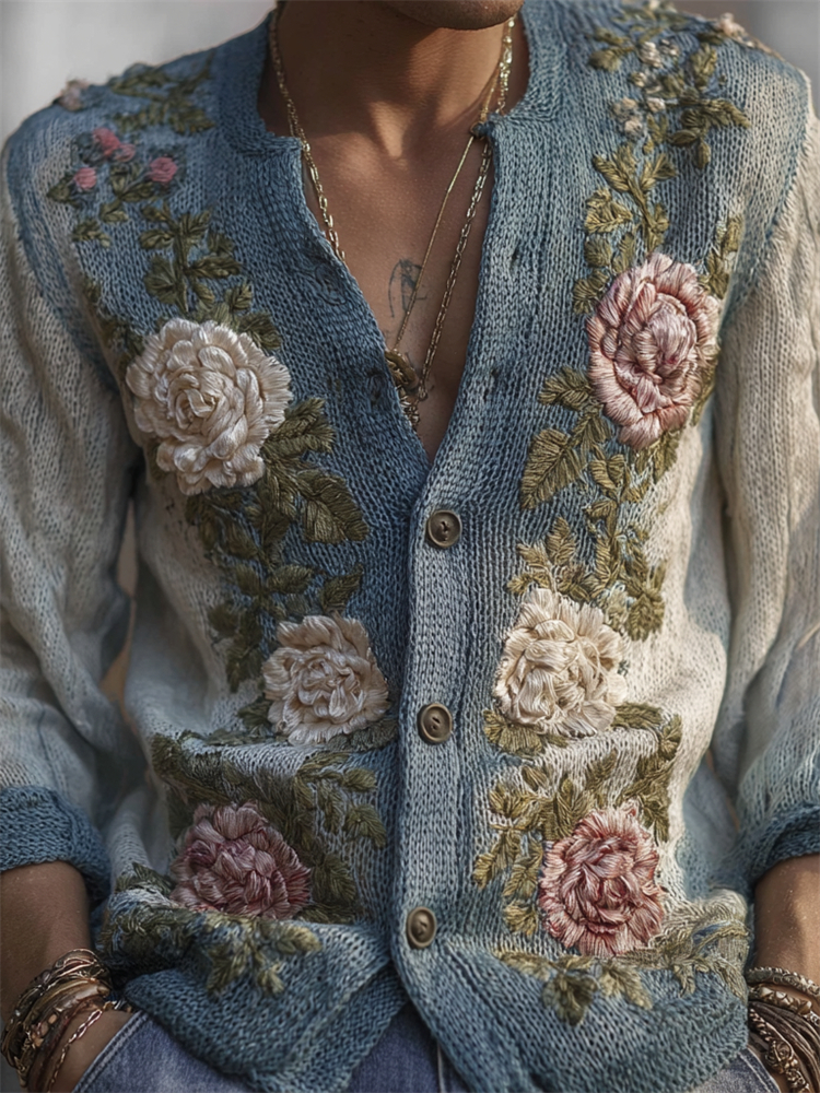 Men's Vintage Roses Crochet Contrast Cozy Knit Cardigan