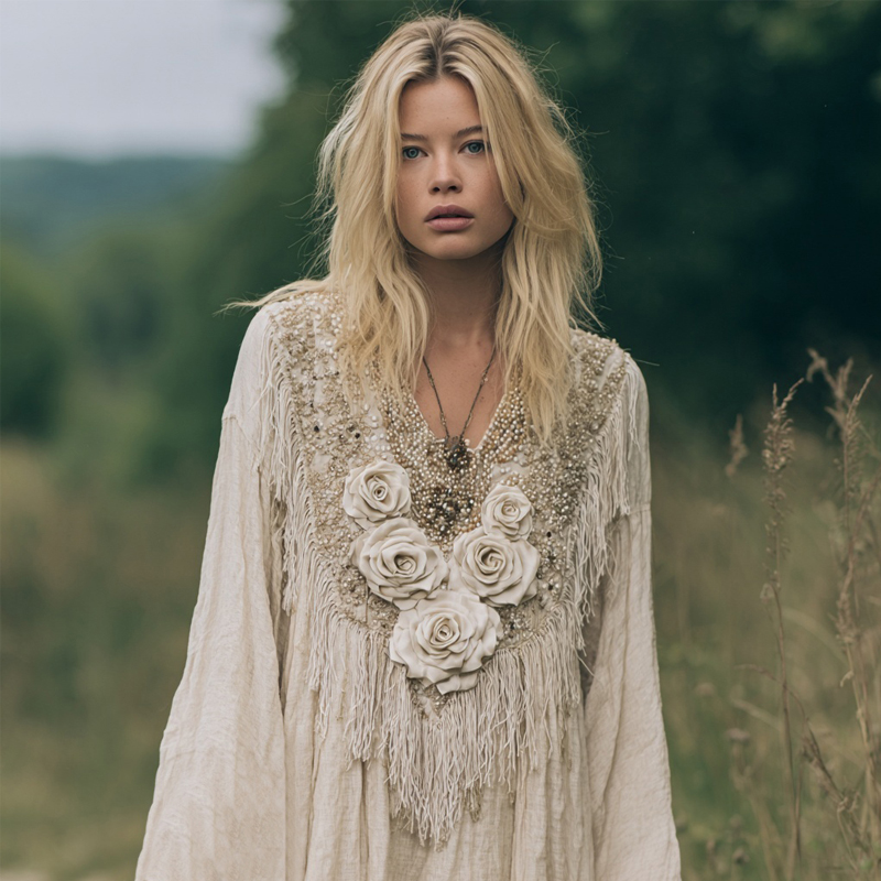 Vintage Boho Roses Embroidered Tassel Linen Tunic