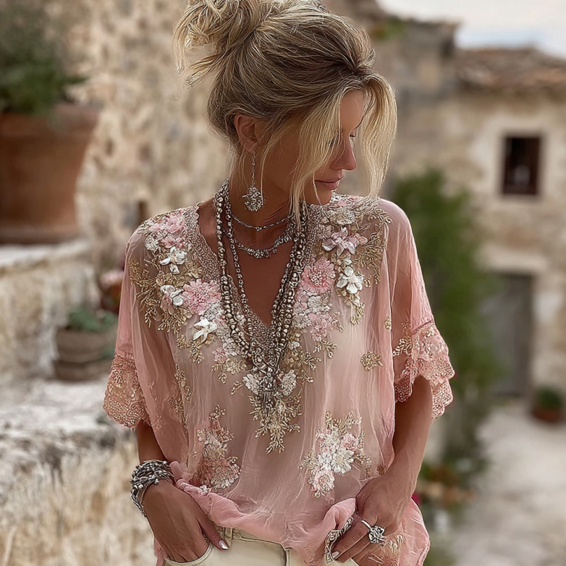 Women's Pink Flower Embroidery Art V-neck Short Sleeve T-shirt
