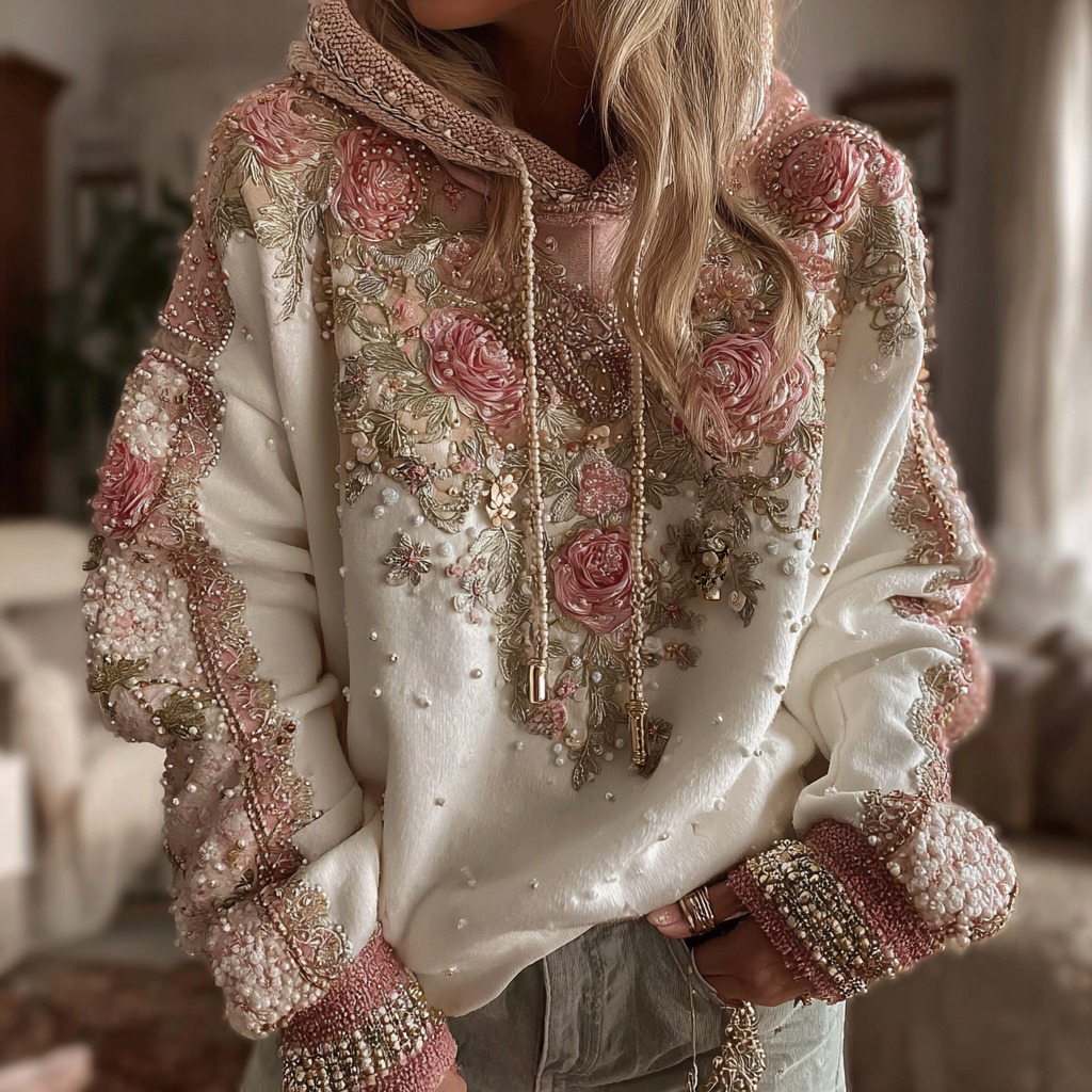 Women's Pink Rose Embroidered Art Casual Gradient Hoodie