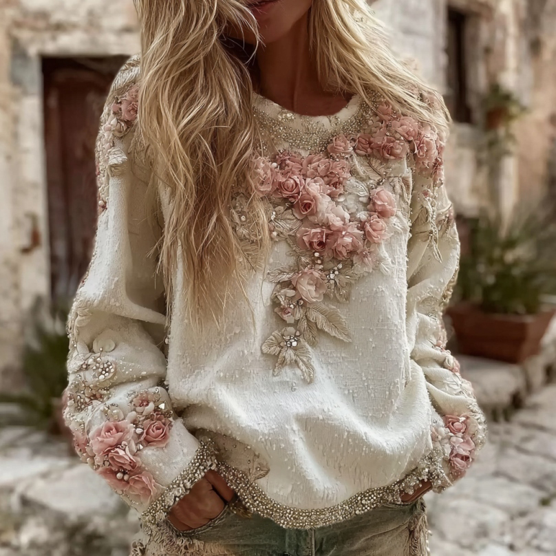 Women's Pink Rose Embroidery Art Round Neck Long Sleeve Sweatshirt