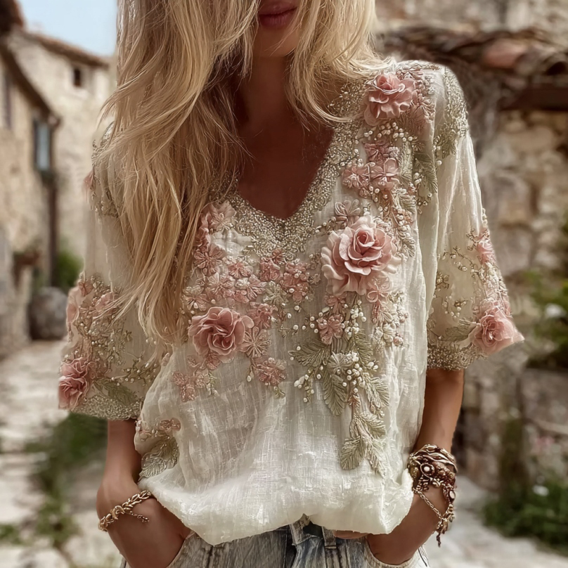 Women's Pink Rose Embroidery Art V-neck Linen Blend T-shirt