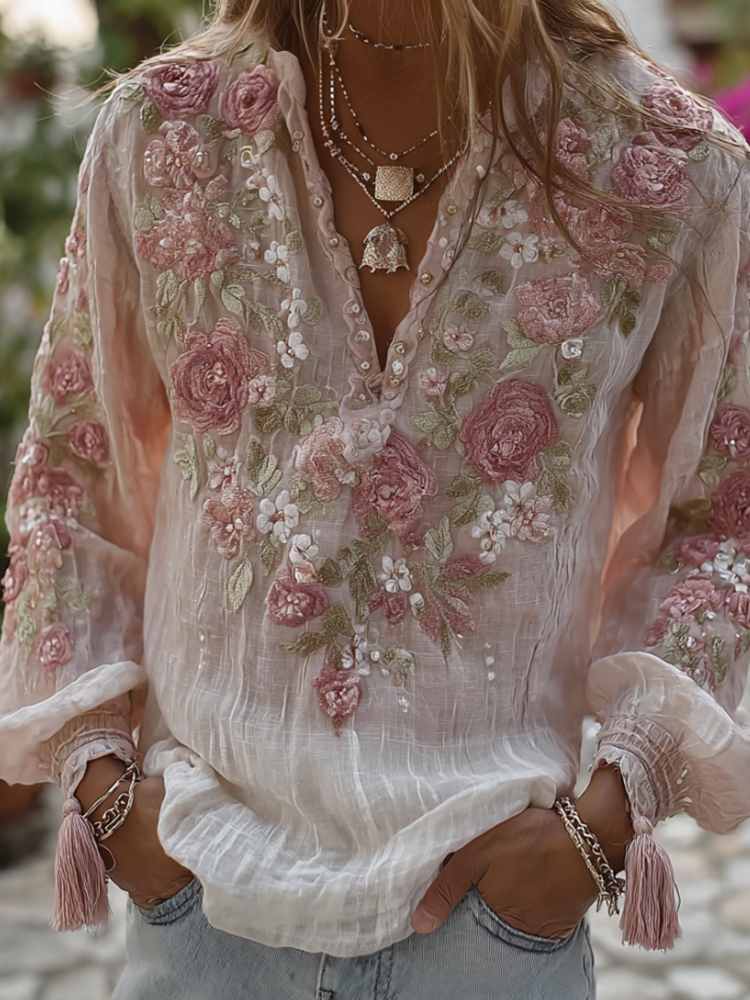 Women's Three-dimensional Romantic Flower Embroidery Casual Retro Long-sleeved Shirt
