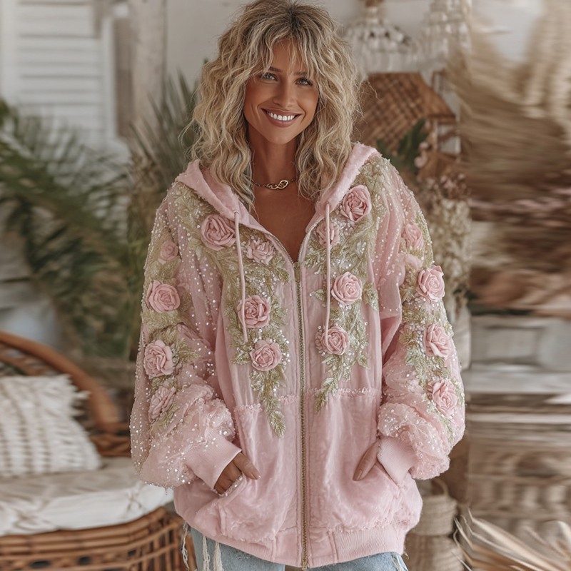 Women's Vintage Pink Rose Embroidery Cozy Warm Zipper Hoodie